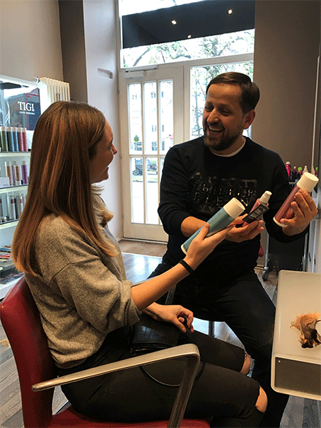 Und weil auch TIGI sich ein Prädikat wie „Copyright" bestimmt nicht ohne Grund an die Brust heftet, wollte es die Redaktion von friseur.com ganz genau wissen. Zusammen mit Model Elena ging es zur Münchner „Cutting Lounge" http://www.cutting-lounge.de von Hair Stylist Mehdi Zaskoku. Er hat das Handwerk bei Tony&Guy gelernt, bei Udo Walz gearbeitet und führt nun seinen eigenen kleinen Salon in der Münchner Innenstadt, wo er nicht nur zahlreichen Kickern des FC Bayern die Haare schneidet, sondern auch oft für Fotoshootings renommierter Marken gebucht wird. Ein Stylist aus Leidenschaft – und ein Fan der neuen Serie von TIGI.
