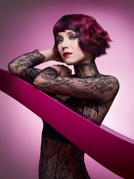 Einen sinnlich starken und leidenschaftlichen Ausdruck versprüht diese Frisur aus der Kollektion Hot Drama von Wella Professionals. Gezielt platzierte und abgegrenzte Himbeernuancen stehen in wirkungsvoller und doch harmonischer Divergenz zu weichen Wellen und fransigen Spitzen.