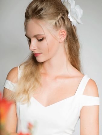 Quer se trate de um vestido de ombros caídos com folhos românticos, de um delicado vestido de fada ou de um vestido rigoroso e simples com poucos folhos: A roupa determina o penteado e deve ser coordenada com ele. Os vestidos que fazem lembrar um casamento de conto de fadas ficam muito bem com um penteado de noiva artisticamente apanhado - dão ao vestido elaborado espaço suficiente para que fique perfeitamente encenado. Se optares por um sonho arejado em renda, os caracóis são uma boa ideia porque realçam a silhueta feminina. Os vestidos estritamente simples, sem muita ornamentação, combinam bem com um chignon rigoroso, talvez com madeixas individuais soltas ou com um bonito adorno de cabelo. E se quiseres ter um casamento tradicional e talvez até casar num ambiente adequado, um penteado com tranças é um penteado de noiva muito bom: durará muitas horas sem sofrer muitos danos.