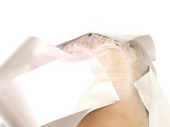 Vom grauen Mäuschen zur blonden Versuchung: das gepflegte, aber glanzlose Ausgangshaar wird mit den drei verwendeten Nuancierungen zu einem Traum aller Blondliebhaberinnen.Verwendete Produkte Rezeptur A: Londa Blondoran Blonding Powder, 1:1,5 mit 4 % Rezeptur B: Londa Professional Cremehaarfarbe 12/89, 1:2 mit 12% Rezeptur C: Londa Professional Cremehaarfarbe 12/0, 1:2 mit 9%zum Stylingzurück zur